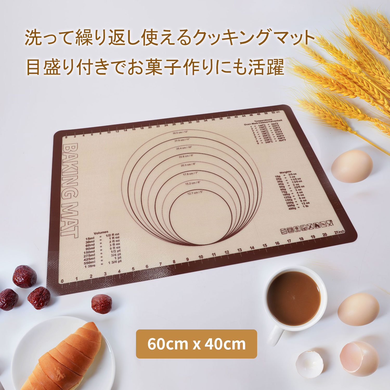 クッキングマット 調理 マット 60×40cm 製菓マット 大きいサイズ パンマット 目盛り付きマット 食品級シリコーン シリコン ベーキングマット シルパット 電子レンジ オーブン 離乳食 キッチン 断熱 滑り止め 水洗い可能 ベーカリー お菓子 製菓道具 おうち時間